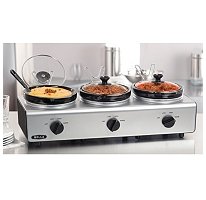 - Three 2.5 quart stoneware pots,Three individual temperature controls.